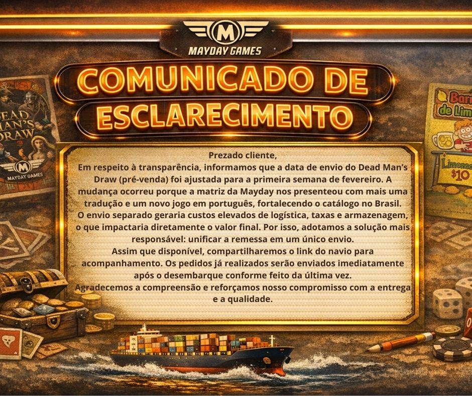 Fabricante e fornecedor dos melhores sleeve cards do mundo (a maior variedade de tamanhos, de medidas e dos produtos da mais alta qualidade!) já há duas décadas no mercado, agora a Mayday e a Sleeve Kings também estão com sua filial ativa e a pleno vapor no Brasil, disponibilizando pra você milhares de itens à PRONTA ENTREGA! Todos os produtos aqui do site da Mayday Games Brasil efetivamente nacionalizados (um estoque gigantesco!) e uma lista de outros jogos para chegarem mês que vem (esses, em pré-venda: "Dead Man's Draw", agora em Português, e também "Barraca de Limonada") significa, na prática, preços mais competitivos, rapidez no envio/recebimento e a garantia da sua tranquilidade para fazer suas encomendas pra já!
