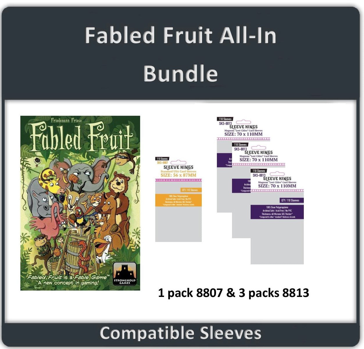 This bundle features all the sleeves you need to sleeve "Fabled Fruit" All-In. See images for more details.