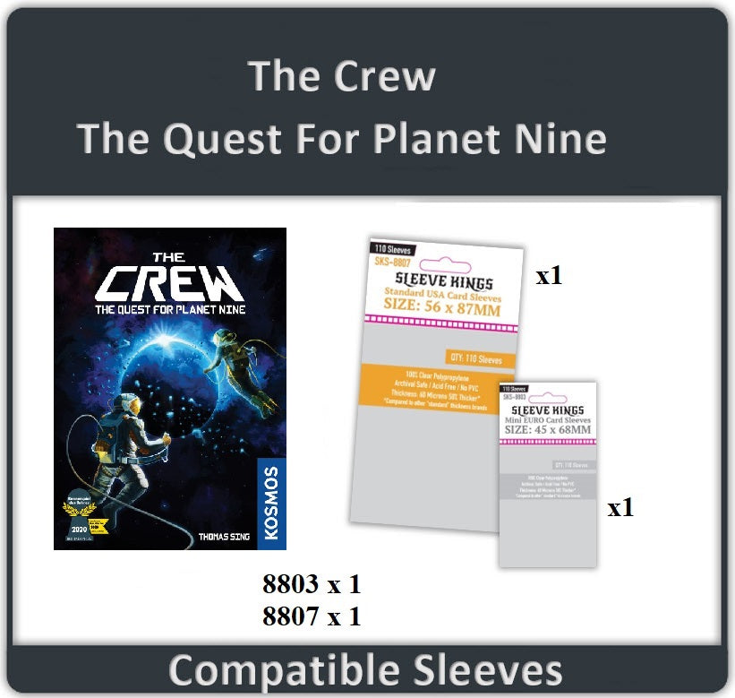 These are all the sleeves you need to sleeve everything for The Crew: The Quest for Planet Nine. See images below for more details. Note we verified the details of this bundle HERE. You are getting one pack each of SKS-8803 and SKS-8807.