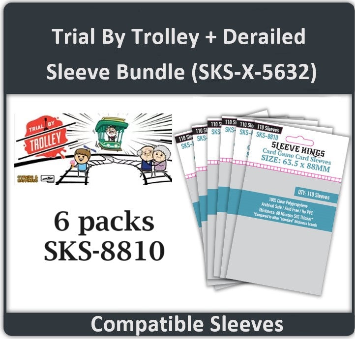 This bundle features all the sleeves you need to sleeve "Trial by Trolley Derailed Edition". See images for more details. Note you are getting 6 packs of SKS-8810 with this bundle, enough for the entire game per BGG HERE.