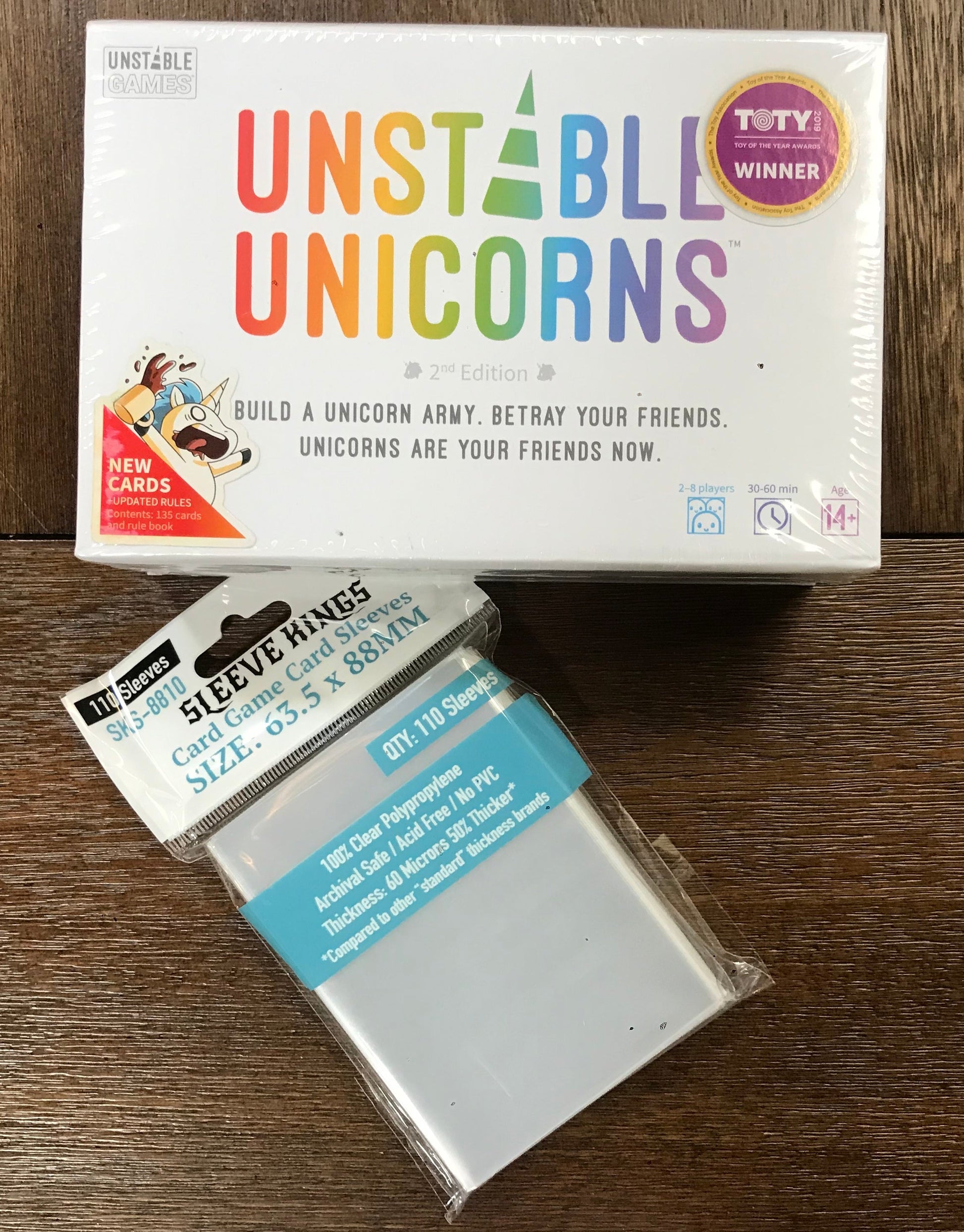 This is all the sleeves for the game "Unstable Unicorns™" plus expansions and promo cards. Game not included. See images below for more details.